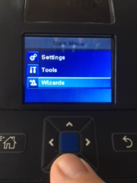 Då visas menyn, där skall ’Wizards’ väljas (pilknapp+blå knapp):